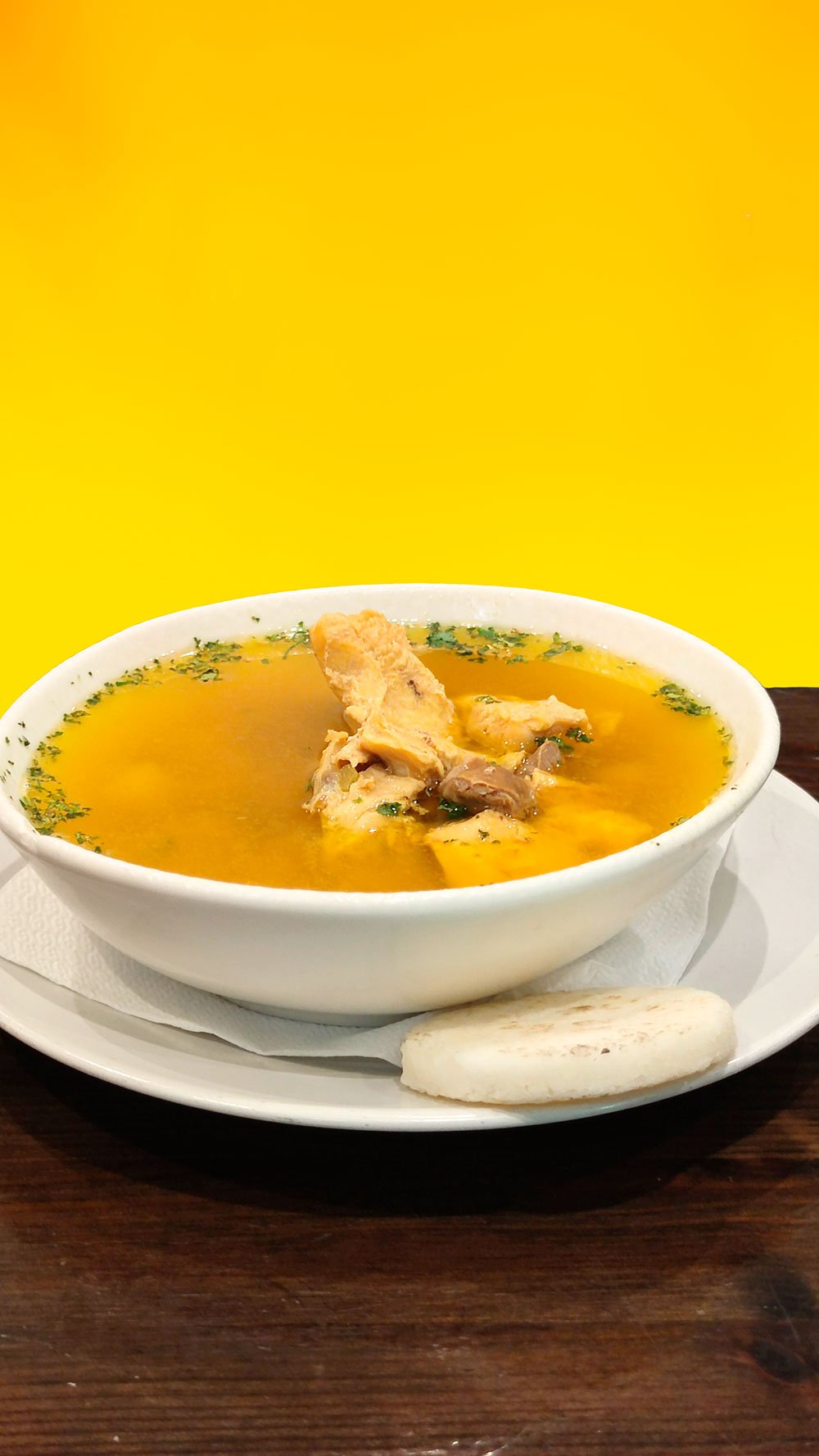 Caldo de pollo,tropiezos de higadillos y mollejas, patatas y trozos de pollo.